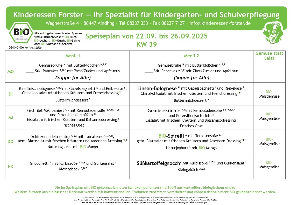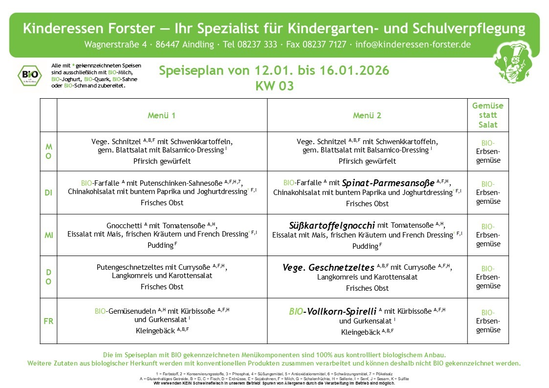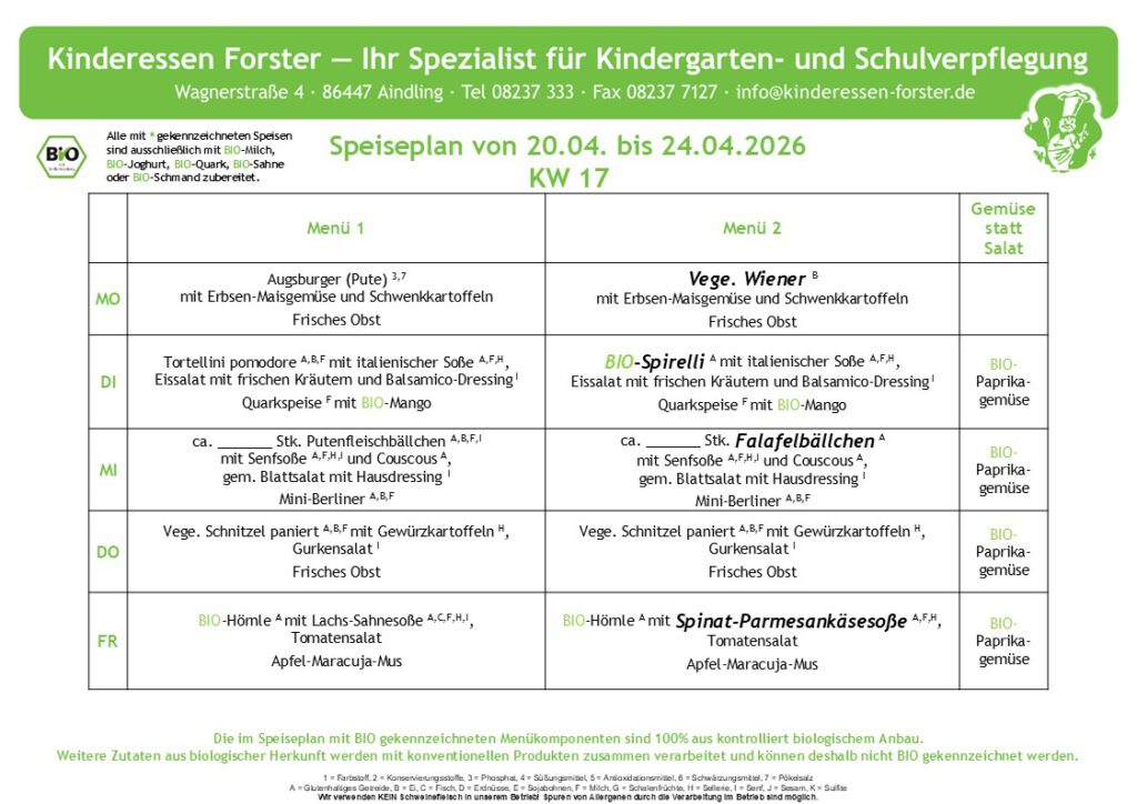 Hier finden Sie die aktuell gültigen Speisepläne der Fernküche Forster